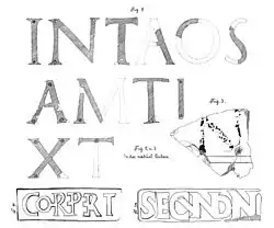 1888 stießen die Ausgräber an der Porta principalis dextra auf eine einstige Bau- oder Ehreninschrift.[24] Diese bestand aus grauem Sandstein, in den der Text leicht vertieft vorgemeißelt worden ist. Anschließend hatte man vergoldete, rund 1 Millimeter dicke Bronzebuchstaben in diese Vertiefungen eingelegt und mit Eisenstiften, die an den Buchstabenecken saßen, in 20 Millimeter tiefen Bohrlöchern verkittet. Die Platte war einst so stark zerschlagen, dass nur noch ein größeres und ein kleineres Fragment aufgefunden wurden. Auf dem größeren Stück ist der Buchstabe „N“ fast vollständig erhalten sowie die oberen beiden Nagellöcher der darunter liegenden Zeile. Einer der wenigen lose aufgefundenen Bronzebuchstaben passt offensichtlich genau in dieses erhaltene „N“. Insgesamt sind folgende Buchstaben in lesbarem Zustand aufgefunden worden: A, I, N, T, T, X. Von einem weiteren „T“ blieb nur der obere Querstrich erhalten, ein „A“ und ein „M“ waren noch fast zur Hälfte erhalten. Von einem „S“ der deutlich gekrümmte Mittelteil. Einem Buchstaben mit einer Rundung ist zu einem Viertel aufgefunden worden. Heinrich Steimle im ORL ergänzte ihn zu einem „O“, auch ein „G“ wäre denkbar. Ein letzter Buchstabe, dessen Serifen verstümmelt sind, ist als „I“ zu betrachten. Die Buchstaben haben verschiedene Höhen, was daran denken lässt, dass sie in unterschiedlichen Zeilen saßen. 90–88 Millimeter hoch sind I, N, T sowie vermutlich die beschädigten Buchstaben A, O, S. Rund 86 Millimeter sind A, M, T und vielleicht das beschädigte „I“. Am kleinsten fällt das „X“ aus, das 75 Millimeter hoch ist. Von den Proportionen her ordnete Heinrich Steimle im ORL auch das fragmentarische „T“ in diese Zeile. Viele Archäologen haben daran gedacht, die Schirenhofer Bronzebuchstaben als Reste einer Ehreninschrift in Zusammenhang mit einem Besuch Kaiser Caracallas (211–217) zu sehen. Ähnlich losen Buchstaben, aber auch erhaltene Inschriften beziehungsweise Inschriftenreste die noch Vertiefungen und Dübelspuren zur Befestigung von Metallbuchstaben aufweisen sind von vielen Limeskastellen bekannt.[25] Steimle hatte überlegt, die fast gleich hohen größten Buchstaben vom Schirenhof als „ANTO[N]I[NV]S“ zusammenzusetzen.