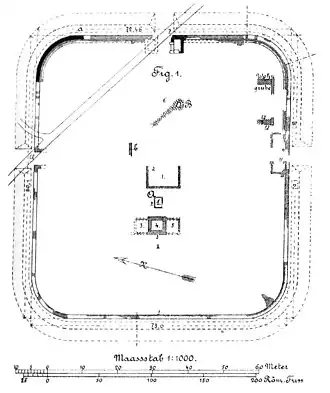 | Wp 10/42 | „Im Säubaumacker“ | ![]() Von Wilhelm Conrady wurde 1883 ein quadratischer Steinturm mit einer Seitenlänge von 5,60 m nachgewiesen.[20] Karl Zangemeister berichtete in diesem Zusammenhang von fein gearbeiteten Gesimsstücken.[21] Luftbildaufnahmen aus dem 20. Jahrhundert schließlich zeigen die dunkle Verfärbung des Ringgrabens eines Holzturmes.[19] |