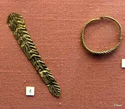 1. Material/Technik: Kollier: Glasperlen, profilierte Goldblechzylinder; Fuchsschwanzkette mit Amulettkapsel: Gold; Halskette: Gagat, Glasflussperlen; Ohrringe: Goldblech, Goldraht, Lapis; Münzen: Bronze, Silberüberzug. Maße: Kollier: L 40 cm; Fuchsschwanzkette: L 44 cm; Kapsel: L 5,2 cm; Ohrringe: H 1,3 cm, B 1,4 cm, hergestellt vermutlich 3.–4. Jahrhundert n. Chr.