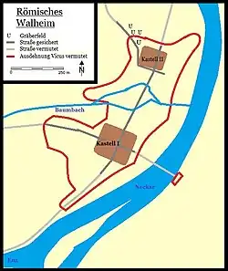 - ↑ Dieter Planck: Das römische Walheim. Ausgrabungen 1980–1988. Landesdenkmalamt Baden-Württemberg, Stuttgart 1991, ISBN 3-927714-38-0 (Archäologische Informationen aus Baden-Württemberg, 18), geht von einer fehlenden Porta decumana aus, Klaus Kortüm und Johannes Lauber: Walheim l. Das Kastell II und die nachfolgende Besiedlung. Theiss, Stuttgart 2004, ISBN 3-8062-1879-X, nimmt demgegenüber vier Tore an.
