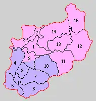 In Flächenfarben die beiden heutigen kreisfreien Städte auf dem ehemaligen Gebiet des Katō-gun, in lila Ono-shi, in pink Katō-shi.