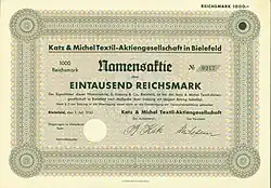 Im Jahre 1934 verstarb der Firmengründer Benno Katz. Sein Sohn Willy Katz wurde im gleichen Jahr in den Aufsichtsrat bestellt und zum Vorsitzenden ernannt, am Tag des Novemberpogroms 1938 floh er vor der drohenden Verhaftung nach Berlin, von dort emigrierte er über Umwege nach Amerika, wo er am 11. Februar 1941 in Cleveland/Ohio starb.[2]