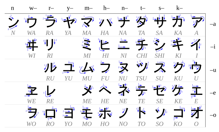 - ↑ a b c Katakana. In: nihongoichiban.com. Nihongo Ichiban, abgerufen am 1. Januar 2020 (englisch, Katakana Tabelle).