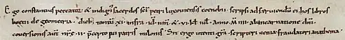 Beispielhaft zeigt ein handgeschriebenes lateinisches Geometrie- und Landvermesser-Lehrbuch, dass es zwischen dem 13. und dem 26. Juni 1004 geschrieben worden ist. Der Schreiber Constantius, ein Priester des Sankt Peter-Klosters in Luxeuil in den Vogesen, notiert in der Schlussschrift, im Kolophon, dass er die Arbeit innert 11 Tagen vollbracht habe. Das Lehrbuch ist in karolingischer Minuskel auf Pergament geschrieben, auf 18 Blättern im Format ca. 36,5 × 28,5 cm. Sehr schön ist auf der ersten Zeile von Blatt 10r ein Dreieck gezeichnet, das nach Pythagoras (6. Jh. vor Chr.) mit dem Seitenverhältnis von 3:4:5 rechtwinklig ist; hier mit römischen Zahlen VI, VIII und X bezeichnet; eingeschrieben ist die Zahl XXIIII (24), welche den Flächeninhalt bezeichnet. Die Handschrift gehört seit 1632 der Burgerbibliothek Bern, ein Geschenk des Berners Jakob Graviseth (1598–1658), der die berühmte Bibliothek seines Taufpaten, des Gelehrten Jacques Bongars (1556–1614) geerbt hatte.[2] Die ganze Handschrift ist digital faksimiliert zu sehen in e-codices[3], das Kolophon des Schreibers Constantius mit Datierung und einem Bücherfluch auf Diebe f. 17verso.[4] Auch im Katalog der datierten Handschriften der Schweiz ist die Handschrift verzeichnet.[5]