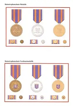 - Stufe I: Bronzene Katastrophenschutz-Medaille für mindestens 10-jährige aktive Dienstzeit
