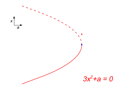 Bei negativen Werten von a hat die Potentialfunktion ein stabiles und ein instabiles Extremum. Nimmt der Parameter a langsam zu, kann das System dem stabilen Minimum folgen. Bei a = 0 treffen sich die stabilen und instabilen Extrema und heben sich auf (Bifurkationspunkt). Für a > 0 gibt es keine stabile Lösung mehr. Ein physikalisches System würde bei a = 0 seine für negative a vorhandene Stabilität plötzlich verlieren und sein Verhalten umkippen.