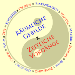 Auf der obersten (ontologischen) Abstrahierungsebene münden die Kategorien wieder in ein komplementäres Begriffspaar: Die Welt erscheint getrennt in räumliche Gebilde und zeitliche Vorgänge,[20] die je nach Blickwinkel in verschiedenen Varianten (wie Beständigkeit ↔ Wandel / Wiedergabe ↔ Neuschöpfung / Ruhe ↔ Bewegung) ausgedrückt werden. Alle Kategorien lassen sich auf diese zurückführen. Die Logik der Kategorisierung folgt unwillkürlich den Gesetzen des materiellen und sozialen Überlebens[5] und dem „ersten empfundenen Gegensatz menschlicher Wahrnehmung“: Ich ↔ Welt. Auch hier wird wiederum deutlich, dass es unvermeidlich ist, die Welt in solche Kategorien zu splitten, obwohl sie in Wirklichkeit ein integriertes Ganzes ist.[21]
