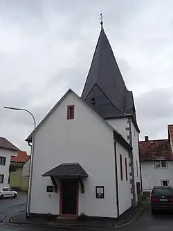 Die Kirche ist am östlichen Ortsrand des alten Dorfkerns in nordöstlicher Richtung errichtet. Der wuchtige Chorturm aus Bruchsteinmauerwerk mit Eckquaderung aus Lungstein weist einen quadratischen Grundriss von 4,30 × 4,30 Meter auf. Der überwölbte Altarraum hat gekehlte, spätgotische Kreuzrippen des 15. Jahrhunderts ohne Konsolen und Reste alter Bemalung.[7] Der Schlussstein ist mit einer Scheibe belegt. Gegen eine Datierung des Turms ins 15. Jahrhundert[8] spricht die Mauerstärke von mehr als einem Meter, die sechs gut dokumentierten, aber nicht mehr erhaltenen Weihekreuze und der schmale, rundbogige Triumphbogen von 2,20 Meter lichter Weite, der keine Kämpfer hat.[9] Die drei kleinen Rundbogenfenster an den drei freien Seiten unterhalb des Gesims stammen wohl aus der Erbauungszeit, die spätgotischen Maßwerkfenster im Erdgeschoss mit Lungsteingewänden, Spitzbogen und Nasen und das Dachwerk aus dem 15. Jahrhundert. Der verschieferte Helmaufbau besteht aus vier gleichseitigen Dreiecksgiebeln aus Fachwerk, die in einen achtseitigen Spitzhelm überleiten, der von Turmknopf, Kreuz und Wetterhahn bekrönt wird.[10]