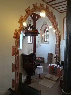 Der Innenraum des Schiffes wird von einer flachen Balkendecke abgeschlossen. Unter den Querbalken verläuft ein Unterzug, der von drei hölzernen Rundsäulen mit Kopfbügen getragen wird. Der mittlere Rundpfosten ist mit dem Jahr 1621 bezeichnet und hat die alte Bemalung mit olivgrünen Weinranken und Trauben. Die beiden anderen Rundpfosten sind rötlich bemalt und datieren von 1809. Die raumbeherrschenden zweigeschossigen Emporen an der West- und Nordseite stammen aus der ersten Hälfte des 17. Jahrhunderts. Die untere Empore zeigt olivgrüne Brüstungsmalereien mit Ornamenten, Bildern und Bibelversen, die obere hat gedrechselte Docken. Die Brüstung mit Schnitzereien an der Bank vor der Südwand ist der Rest eines Herrschaftsstuhls und zeigt unter fünf Rundbögen die vier Evangelisten mit ihren Symbolen und im Mittelfeld König David, der in einer Gebetshaltung die Auferstehung Jesu Christi visionär vorhersieht.[9]