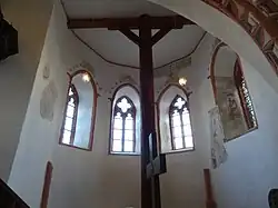 Die erhaltenen Dienste weisen auf ein Chorgewölbe. Eine Flachdecke im Chor wird von einer zentralen, hölzernen Rundsäule gestützt. Die 1961/62 freigelegten Wandmalereien zwischen den Chorfenstern zeigen die Muttergottes auf der Weltkugel, den hl. Hieronymus, die hl. Katharina und Fragmente des Jüngsten Gerichts hinter der Kanzel. Die Fensterlaibungen haben barocke Puttendarstellungen von 1743.[8]
