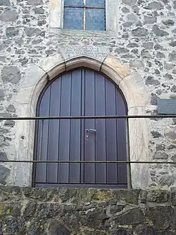 Der hohe Rechtecksaal in Nord-Süd-Ausrichtung wird durch ein Schopfwalmdach abgeschlossen. Die an der Westseite verlaufende Steintreppe ermöglicht durch ein spitzbogiges Portal mit Gewände aus Lungstein den ebenerdigen Zugang zur ersten Empore. Das Spitzbogenportal mit rotem Sandsteingewände zur oberen Empore trägt ein Wappen und ist seit den 1960er Jahren vermauert.[7] Ebenfalls vermauert ist ein Spitzbogenfenster mit Maßwerk zwischen den beiden Westportalen, sodass die Westseite heute fensterlos ist. An der Ostseite des Schiffs ist links der Kanzel, noch innerhalb der Bogennische, ein rechteckiges Fenster eingelassen. Ein weiteres schmales Spitzbogenfenster mit Laibung ist in der nördlichen Ostmauer und eins oberhalb des Nordportals angebracht.
