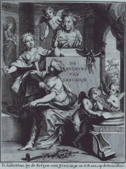 Frontispiz der „Gesammelten Werke“ (De mengelpoëzy van Katharyne Lescailje) von Katharina Lescailje, Stich von Nicolaas Verkolje, 1731. Die Büste in der Mitte stellt Lescailje als zehnte Muse dar.