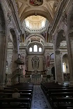 Das Innere der Kirche mit dem Grundriss eines lateinischen Kreuzes besteht aus drei Schiffen mit einem Querschiff und Seitenkapellen, von denen sich jeweils drei in die beiden Seitenschiffe und vier in das Querschiff befinden.
