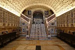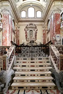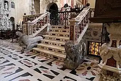 Der Fußboden, der 1956 nach dem ursprünglichen Muster aus dem 17. Jahrhundert erneuert wurde, besteht aus polychromem Marmor.