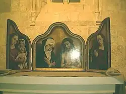 An der linken Wand, über der Tür zur Sakristei, befindet sich das Polyptychon der Kreuzigung, das zwischen 1528 und 1530 gemalt und Michael oder Pietro Cavaro zugeschrieben wird. Das Gemälde zeigt die Madonna mit Kind, die Kreuzigung Jesu, die Verkündigung, den Heiligen Hieronymus, den Heiligen Matthäus und den Heiligen Bartholomäus.