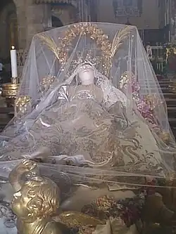 Titularheilige der Kathedrale von Cagliari ist die Jungfrau Mariä Himmelfahrt, der die Pisaner die romanische Kirche in Castel di Castro widmeten. In der Kathedrale von Cagliari, wie auch in mehreren anderen Kirchen der Insel, ist die Verehrung der Mariä Himmelfahrt mit der eng verwandten Verehrung der Mariä Entschlafung verschmolzen. In den Tagen vor dem 15. August, dem Hochfest Mariä Himmelfahrt, und während des gesamten Oktav (der darauf folgenden Woche) wird das Simulacrum der Dormitio Virginis (der schlafenden Jungfrau Maria, die mit Leib und Seele auf die Auferstehung und die Aufnahme in den Himmel wartet) auf einer mit zehn goldenen Engeln geschmückten Katafalk im Kirchenschiff aufgestellt, um von den Gläubigen verehrt zu werden. Das Simulacrum der schlafenden Madonna, ein Werk der sizilianischen Schule des 19. Jahrhunderts, wurde von der zukünftigen Königin Maria Cristina von Bourbon-Sizilien, Ehefrau von Karl Felix von Savoyen, während des Aufenthalts des savoyischen Hofes in Cagliari (1799–1814) gestiftet. Auch heute noch wird das Simulacrum anlässlich seiner Ausstellung in der Kathedrale von Vertretern der Adelsfamilien, denen die Hofdamen von Maria Cristina in Cagliari angehörten, nämlich den Familien Amat, Manca di Villahermosa und Sanjust, in prächtige Gewänder gekleidet, um das Privileg zu bekräftigen, das ihnen von Maria Cristina für die Erfüllung dieser einmaligen Aufgabe gewährt wurde. Die hölzerne Madonnenstatue wurde der Stadtverwaltung von Cagliari gestiftet und zunächst im Rathaus neben der Kathedrale aufbewahrt. Als die Stadtverwaltung zu Beginn des 20. Jahrhunderts in den neuen Palazzo in der Via Roma umzog, wurde das Simulacrum dem Metropolitankapitel anvertraut und anschließend in der Sakristei der Kathedrale aufbewahrt.