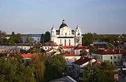 Als Gründer der Kirche und des Kollegs gelten der polnische König Sigismund III. Wasa, der Bischof Marcin Szyszkowski und Paweł III. Wołucki. Der Architekt M. Gints erarbeitete den Bauplan, der später vom Architekten Djakomo Briano ergänzt und geändert wurde. Nach dessen Plänen wurde der Grundstein im Fundament am 16. Juli 1616 gelegt. In der zweiten Hälfte der 1630er Jahre beendete man den Kirchenbau im Renaissancestil. Die Jesuitenkirche wurde an der Stelle des Einfahrtsturms der Okoljnyj Burg so gebaut, dass sie die Burgmauer ersetzte und die Hauptfassade neben dem Einfahrtstor der Burg war. Das Kolleggebäude wurde in der Mitte des 17. Jahrhunderts nach Plänen des Architekten Benedetto Molli errichtet.
