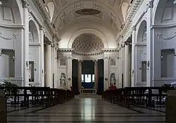 Der Saal besitzt ein Tonnengewölbe und wird von vier halbkreisförmigen Fenstern auf jeder Seite beleuchtet; unterhalb befinden sich vier Seitenkapellen: die ersten drei halbkreisförmig, mit einem Marmoraltar, der von einem zwischen zwei leeren viereckigen Nischen platzierten Altarbild überragt wird. Die Kapellen auf der rechten Seite sind den Heiligen Kosmas und Damian, dem Schutzengel, dem Heiligen Hieronymus und der Jungfrau Maria gewidmet, ihr Altarbild von Marcello di Piacenza aus dem Jahr 1577 stellt die Madonna mit dem Ring der Heiligen Heliodonia dar. Die Kapellen auf der linken Seite sind den Heiligen Abt Mauro, Gregor dem Großen, dem Apostel Andreas und dem Allerheiligsten Sakrament gewidmet (mit Leinwandgemälden der Heiligen Anatolien und Audace von Antonio Concioli, datiert 1775). An der Gegenfassade rahmt ein großer Rundbogen den Chor aus polychromem Marmor ein, der auf toskanischen Säulen aus Neros Villa in Sublacense ruht.[12] Der Chor ist etwas höher als der Rest der Kirche; der Apsisbogen wird von den 1852 von Ercole Dante geschaffenen Gipsstatuen des heiligen Benedikt und der heiligen Scholastika flankiert, die sich in zwei Doppelnischen befinden.[8] Zu beiden Seiten des Chors befinden sich zwei Reihen von Holzgestühlen, die den Chor bilden, den die Mönche während der liturgischen Feiern benutzen. Der unter dem Apsisbogen platzierte Hochaltar ist aus polychromem Marmor mit aufgetragenen goldenen Verzierungen und wird von einem Kruzifix mit einem Holzkreuz und Christus in Bronze von Enzo Assenza (1975) überragt.