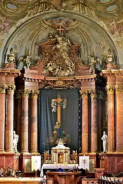 Über dem Portal erhebt sich eine Doppelturmfassade, auf deren Sims die Statuen der drei Heiligen Stephan, Ladislaus und Emmerich stehen. Beide Türme tragen Uhren. Der Chor mit Altar und die Kanzel wurden von dem österreichischen Architekten Franz Anton Hillebrandt entworfen. Das Altarbild stellt den knienden Stephan beim Überreichen der Stephanskrone an die Gottesmutter dar. Der Altar wurde von Vinzenz Fischer unter Verwendung von rotem Marmor mit korinthischen Säulenkapitellen gefertigt. Die imposanten Deckenfresken über das Leben des hl. Stephan stammen von Johann Cymbal. Die Stationen des Kreuzwegs sind Arbeiten des Bildhauers Barna Búza aus den 1950er Jahren. In der Unterkirche ist der Sarkophag von Béla III. und seiner Frau zu sehen.[3]