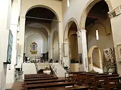 Über dem Eingangsportal befindet sich eine Nische mit der Kopie der Büste von Papst Innozenz X., deren Original des Bildhauers Alessandro Algardi aus dem Jahr 1652 im Bischofspalast aufbewahrt wird. Wertvoll sind zwei Basreliefs an der Vorderseite der Ambos, vermutlich von Agostino di Duccio (1418–1481). An der rechten Wand, in der Nähe der Sakramentskapelle, hängt ein Altarbild aus glasiertem Terrakotta von Jacopo Beneventano, das 1522 für die Kirche San Pietro in Auftrag gegeben und 1881 in die Kathedrale kam. Hinter dem Altar steht das wertvolle hölzerne Chorgestühl, das zwischen 1685 und 1688 beim Bildhauer Matteo Monsù gefertigt wurde. Am unteren Ende des Mittelschiffs befindet sich ein Travertin-Taufbecken aus der Kirche San Vittoria, das die zwölf Apostel darstellt.