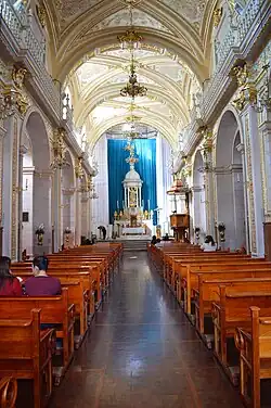 Außer der Vierungskuppel gibt es zwei kleinere Kuppeln in den Seitenschiffen. Die ionischen Säulen des Innenraums sind im klassizistischen Stil dekoriert. Die ursprünglichen drei barocken Altarbilder wurden durch klassizistische Altäre ersetzt. Das Bild der Himmelfahrtsmadonna, Patronin der Stadt und der Diözese Aguascalientes, wurde im Jahr 1919 aus Spanien gebracht, um das alte Bild zu ersetzen.