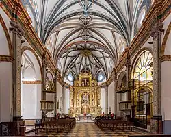 Das insgesamt eher einfach gestaltete Renaissance-Langhaus des nur einschiffigen, aber mit Seitenkapellen ausgestattetes Kirchenbaus ist nur etwa 10 m hoch; es wird über zahlreiche hoch gelegene Rundfenster belichtet, welche in den Stichkappen der Gewölbeansätze angebracht sind. Gegenüber der Apsis mit dem Hauptaltar befindet sich ein quadratischer Raum (coro) mit dem Chorgestühl (sillería). Es gibt nur ein Portal auf der Nordseite des Kirchenbaus.