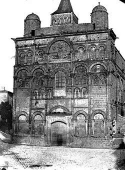 Die Fassade ist eine mehrgeschossige, durch fünffache Bogenstellung in mehreren Reihen aufgeteilte Schauwand mit einem selbst für westfranzösische Gewohnheiten außergewöhnlich reichen figürlichen und ornamentalen Skulpturenschmuck. Sie ist fest datierbar auf 1115–1136,[2] allerdings fällt in diesen Zeitraum ein Wechsel in der Fassadenkonzeption (Brauer). In der Ikonographie ihrer 75 Figuren verbinden sich Elemente der Himmelfahrt Christi[3] mit Standardmotiven der Maiestas Domini[4] und des Weltgerichts.[5] Das apokalyptische Jüngste Gericht war an den Westfassaden mittelalterlicher Kirchen, also dort, wo auch tatsächlich Gericht gehalten wurde, häufig dargestellt.