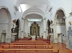 Im unteren Teil der Seitenwände der Kirche sind bildliche Azulejo-Kacheln angebracht. Der Kirchenraum selbst hat zwei gegenüberliegende Kanzeln und ein barockes Altarretabel mit gesprengtem Giebel. Bei den Seitenkapellen sticht die reichhaltige Ausstattung der Rosenkranzkapelle (Capela de Nossa Senhora do Rosário) besonders hervor.