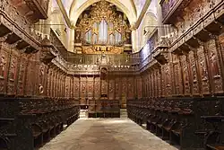 Das Innere der dreischiffigen und ca. 70 m langen und 40 m breiten Kirche ist durch einen Binnenchor (coro) verstellt; unterhalb des Chors befindet sich eine Krypta.