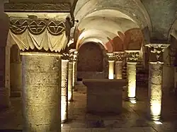 Die Krypta war im Mittelalter vermauert und vergessen. Sie wurde erst im 15. Jahrhundert wiederentdeckt. Dieser Umstand trug vermutlich dazu bei, dass die ursprüngliche Ausgestaltung erhalten blieb. Über zwei Säulenreihen mit vereinfachten korinthischen Kapitellen spannt sich ein romanisches Kreuzgewölbe. Die Bogenlaibungen oberhalb der Kapitelle sind mit ockerfarbenen Zeichnungen musizierender Engel mit unterschiedlichen Instrumenten verziert. An den Seitenwänden befinden sich farbenprächtige Fresken.