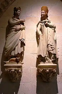 Das auffallend regelmäßige Mauerwerk des oberen Kreuzgangs mit einer durchgängigen Lagenhöhe von 39 Zentimetern lässt sich durch einheitliche Steinmetzzeichen einem einzigen Bautrupp zuordnen. Auch die Rückenplatten eines großen Teils der Wandskulpturen sind nahtlos in das Mauerwerk eingefügt und entsprechend zugeschnitten, diese Skulpturen sind also gleichzeitig mit dem Mauerwerk entstanden.[15] Zu dem Bestand an Originalskulpturen zählt das Königspaar links vom ursprünglichen Zugang zum oberen Kreuzgang aus dem südlichen Querschiff. Es handelt sich wahrscheinlich um Darstellungen von König Ferdinand III. und Beatrix von Schwaben, deren Vermählung am 30. November 1219 noch im romanischen Vorgängerbau der Kathedrale stattfand. Zwischen dem Königspaar und dem Haupteingang befindet sich eine Darstellung des Heiligen Paulus, der sich dem Portal zuwendet, mit ihm korrespondiert die Figur des Petrus im südwestlichen Eckjoch.