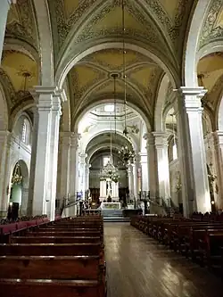 Die dreischiffige, aber beidseitig mit Seitenkapellen versehene Kirche ist in einem nüchternen Barockstil gehalten. Die jeweils gleich hohen inneren Kirchenschiffe bilden eine Hallenkirche, die oberhalb der Seitenkapellen wie bei einer Basilika beleuchtet wird. Oberhalb der Vierung, in der auch der Hauptaltar steht, erhebt sich eine große Kuppel über einem achteckigen, durchfenstertem Tambour; die außen auf der Kuppel aufsitzende Laterne wird im Innern nicht sichtbar. Quadratische Pfeiler mit Pilastern tragen die vier Joche des Langhauses, die Kuppel und die zwei Joche des Chors des Hauptschiffs und entsprechend der Seitenschiffe.