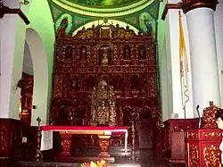 Der Kirchenraum unter einem hölzernen Satteldach wird durch zwei Säulenreihen in drei Schiffe aufgeteilt. Der Altarraum wird durch eine darüber liegende Kuppel beleuchtet. Auf der rechten Eingangsseite steht der Glockenturm mit einem achteckige Aufsatz und Kirchenuhr. Erwähnenswert sind das Altarbild im barocken Kolonialstil des Churriguerismus, das von José Quiñones geschaffen wurde, sowie die Buntglasfenster, die Franz Xaver Zettler in München hergestellt hat.