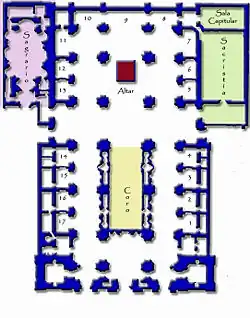 Die Zweiturmfassade ist insgesamt etwa 55 m breit; durch die im rückwärtigen Teil angefügten Bauteile (Sakristei und Sagrario) ergibt sich eine Gesamtbreite der Kathedrale von ca. 70 m. Der dreischiffige, apsidenlose, aber mit Querhaus und Seitenkapellen versehene Bau hat eine Länge von ca. 100 m.