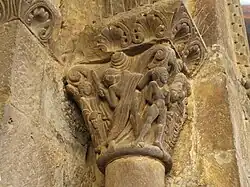 Die zahlreich erhaltenen romanischen Kapitelle,[20] Kragsteine und Metopen sind von mindestens zwei verschiedenen Künstlern oder Werkstätten gefertigt und zeigen überwiegend szenische Darstellungen. Wände und Sockel dagegen sind eher geometrisch dekoriert. Der Umgang mit nackten Figuren ist für die frühen Arbeiten stark antikisierend. Die Formen der Kragsteine sind eng mit der Bauskulptur in San Martín in Frómista verwandt. Die späteren, die einem Meister von Jaca zugeschrieben werden, haben das antikisierende Moment aufgegeben.[21]