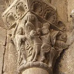 - Die erste wird auf die Jahre bis etwa 1094 datiert[6], was der Herrschaft von Sancho I. und der Amtszeit des Bischofs García Ramírez von Aragón entspricht, einem nahen Verwandten des Königs. Die Bauplastik dieser Phase repräsentiert zusammen mit San Martín in Frómista, der Burgkapelle Santa María im Castillo de Loarre und dem ersten Bauabschnitt der Kathedrale von Santiago de Compostela die ersten Schritte eigenständiger spanischer Romanik.[7]