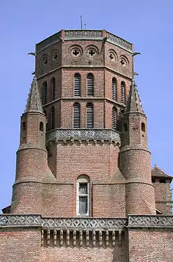 Der gesamte Bau ist – nach tolosaner Vorbildern – im Wesentlichen aus Mauerziegeln erbaut; der von weither herbeizuschaffende und deshalb teure Sandstein findet sich an einigen Gesimsen und Ecksteinen oder an den Säulen, Kapitellen oder Archivolten des Portals. Im Außenbereich der Wände, v. a. im unteren Bereich des Glockenturms, sind überdies einige Bruchstücke aus Sandstein vermauert, die möglicherweise vom Abriss der älteren Kirche stammen und hier als Spolien weitere Verwendung fanden.
