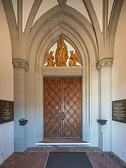 Bis in die Zeit nach dem Zweiten Weltkrieg befand sich die traditionelle Grablege des Hauses Liechtenstein im Paulanerkloster Wranau (Vranov u Brna, Mähren). Für die jüngere Linie bestand eine Familiengruft in Mährisch Kromau. Nach dem Zusammenbruch der österreichisch-ungarischen Monarchie mussten die liechtensteinischen Fürsten ihre südmährischen Schlösser in Lednice (Eisgrub) und Valtice (Feldsberg) verlassen. Nachdem Österreich im März 1938 an das Deutsche Reich angeschlossenen wurde, entschied sich der neu regierende Fürst Franz Josef II. als erster Fürst Liechtensteins – aufgrund der Ablehnung des Nationalsozialismus –, seinen Wohnsitz nach Liechtenstein auf Schloss Vaduz zu verlegen.[7] Dadurch wurde es auch notwendig, eine neue Familiengrablege zu errichten. 1960 wurde die Fürstliche Gruft bei St. Florin nach Plänen des liechtensteinischen Architekten Hans Rheinberger errichtet. Die Grabstätte enthält einen Altar mit einem steinernen Kreuz. Die Eingangstür der Gruft ist ein im Jahre 1992 gefertigtes Hochrelief aus Bronze des italienischen Künstlers Carmelo Pozzolo mit einer künstlerischen Darstellung der Auferweckung des Lazarus. Über der Tür steht das fürstliche Wappen ebenfalls in Bronze.