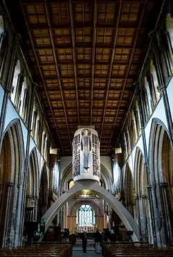 Der Chor wird durch einen Betonbogen vom Langhaus getrennt, auf dem sich ein Zylinder mit der von Sir Jacob Epstein aus Aluminium gefertigten Skulptur Christ in Majesty befindet. Die Buntglasfenster waren im Zweiten Weltkrieg teilweise ausgelagert, weshalb im Chor noch unter anderem von William Morris und Edward Burne-Jones entworfene Fenster erhalten sind.[5] Das Ostfenster der Lady Chapel wurde 1951 von Geoffrey Webb gestaltet. In der Kirche finden sich mehrere Grabdenkmäler, unter anderem für den 1496 gestorbenen Bischof Marshall sowie die aus dem späten 19. und frühen 20. Jahrhundert stammenden Grabdenkmäler für die Bischöfe Alfred Ollivant und Richard Lewis.
