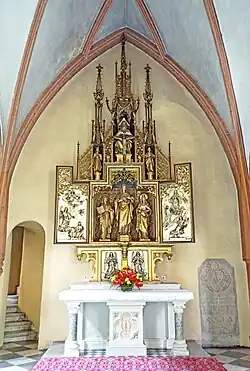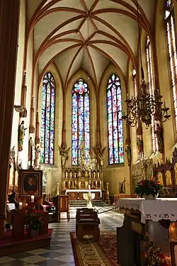 Jozef Holzinger schuf das Chorgestühl, das 1771 fertiggestellt wurde. Vergoldete Reliefs zeigen Szenen aus der Legende Johannes des Täufers. Hier befinden sich auch die Kathedra und eine Statue des seliggesprochenen Bischofs Anton Martin Slomšek. Er verlegte den Bischofssitz von St. Andrä nach Maribor. Sein Grab befindet sich in der barocken Kreuzkapelle.