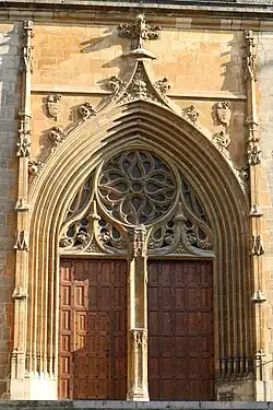 Über dem Portikus dominiert eine Rosette die Westfassade, die im 17. Jahrhundert vom Glasmacher Pierre de Leneville geschaffen wurde. Darüber existiert ein Denkspruch von Ange Peytavin, Pfarrer von Mialanes (heute Le Malzieu-Forain): "Rome épanouie entre ciel et terre. Quel ange est venu te fleurir ? Quelle main te mit face au sanctuaire ? Du roc de chez nous, qui t'as fait jaillir ? Pierre Leneville, Enfant d'Orléans, qui dans notre ville porta son talent." ("Rom erblüht zwischen Himmel und Erde. Welcher Engel kam, um dich erblühen zu lassen ? Welche Hand stellte dich an die Fassade des Heiligtums ? Wer ließ dich aus den Steinen unserer Heimat erstehen ? Pierre Leneville, ein Kind von Orléans, der sein Talent in unsere Stadt trug.")[30]