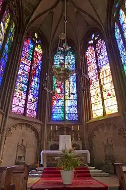 Der Chor entstand, zusammen mit der Krypta unter ihr, im 16. Jahrhundert. Am Choreingang steht der antike Thron des Heiligen Klemens. Der Sitz aus Cipollinmarmor ist seit der Merowingerzeit der Sitz der Bischöfe. Geschnitten wurde er aus einer römischen Säule. Der Hochaltar aus Marmor aus dem Jahr 1865 ist ein Werk von Petitmangin und Racine. Das Chorgestühl schuf Theophile Klem in Colmar. Es wurde 1922 in der Kathedrale fertiggestellt. Die Chorschranken des Architekten Schmitz sind von 1912, die Balustraden und Gitter des Chorumgangs aus dem Jahr 1882 von Tornow[26]. Die großen Fenster des Chores von Valentin Bousch wurden 1539 vollendet. Die drei Fenster des Rundgangs haben die Herzöge von Lothringen gestiftet[27]. Die Chagallfenster wurden in Reims von Charles Marq angefertigt. Man findet sie über den Türen zur Sakristei und zum Turm der goldenen Kugel. Sie zeigen das Opfer Abrahams und weitere Ereignisse des alten Testaments. Der Chorrundgang enthält drei Kapellen: Die Sankt-Josef-Kapelle zeigt im Schlussstein des Gewölbes das Wappen des Kapitels. Die Fenster stammen aus dem 16. Jahrhundert, zwei aus der Sankt Barbara Kirche. Die Scheitelkapelle und ihr Altar sind der Jungfrau Maria geweiht. Hier zeigt der Gewölbeschlussstein Wappen und Namen des Kardinals Johannes IV. von Lothringen. Das mittlere Fenster mit den Heiligen Stefanus und Paulus ist von 1522, die beiden anderen sind aus dem 19. Jahrhundert und zeigen zwei Bischöfe. Die östliche Kapelle trägt seit 1868 den Namen des Heiligen Livius. Das Fenster mit einem nicht identifizierten Heiligen ist aus dem 16. Jahrhundert. Die beiden anderen aus der Kirche St. Barbara. Weiter enthält die Kapelle Epitaphe und Grabmale ehemaliger Bischöfe von Metz. Südöstlich hiervon schließt der Chor mit zwei Renaissancetüren ab: Die erste vom Scheitelpunkt gesehen führt in den Turm Karls des Großen, die Zweite in eine gewölbte Sakristei aus dem 16. Jahrhundert. Die Fenster über den Türen aus dem Jahr 1882 stammen von Schmitz-Reuter aus Aachen: links die Kirchenväter, rechts die Wurzel Jesse. Rechts der zweiten Tür steht ein neugotischer Flügelaltar. Er zeigt unter anderem den Heiligen Clemens mit dem Drachen Graoully und Franz von Assisi.[28] Die Weihe des neuen Altars und des übrigen liturgischen Mobiliars fand am 17. Dezember 2006, dem dritten Adventssonntag (Gaudete), statt. Am selben Tag wurde dem Domplatz vor der Kathedrale der neue Name „Place Jean-Paul II“ zu Ehren von Papst Johannes Paul II. verliehen, der am 10. Oktober 1988 ein Pontifikalamt im Metzer Dom zelebriert hatte und am 2. April 2005 verstorben war.