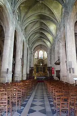 Das Langhaus ist in sieben Joche gegliedert. Weite Arkaden öffnen sich vom Hauptschiff zu den Seitenschiffen. Die Kapitelle des linken Seitenschiffs sind im Stil der Frührenaissance mit kleinen Figuren und Köpfen verziert, die Kapitelle der rechten Seite sind korinthisch inspiriert. Unter der Vierung ist noch das Kreuzrippengewölbe aus der Mitte des 16. Jahrhunderts erhalten. Auf den Schlusssteinen sind die Dreifaltigkeit und die Evangelisten mit ihren Symbolen dargestellt. Das Monogramm F verweist auf den französischen König Franz I. und die Halbmonde auf Heinrich II., der ihm 1547 nachfolgte.