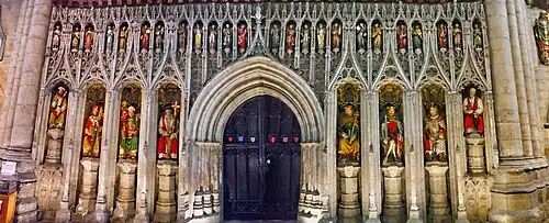 Die Chorschranke wurde vom Restaurator George Gilbert Scott auf ca. 1494 datiert, es gibt aber bereits ein Dokument von 1408, das eine Chorschranke erwähnt. Sie ist volle acht Fuß stark und wurde in jüngerer Zeit durch große Statuen von acht Königen und Bischöfen beiderseits des Durchgangs und weitere 24 Statuen in darüberliegenden Nischen ergänzt.[15] Die acht im Großformat porträtierten Personen haben in der Geschichte der Kathedrale jeweils eine bedeutsame Rolle gespielt. Die Statuen wurden vom Bildhauer Esmond Burton (* 1886; † 1964) angefertigt und 1947 von der damaligen Princess Royal Mary of York, Tochter Georgs V., enthüllt. Von links nach rechts handelt es sich im Einzelnen um:[16]