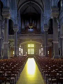 Die in einem Mischstil aus neoromanischen und neogotischen Elementen gestaltete Architektur des fünfschiffigen ca. 80 m langen und 30 m breiten Bauwerks ist basilikal; der Glockenturm (clocher) erreicht eine Höhe von etwa 40 m. Das Mittelschiff und die beiden inneren Seitenschiffe sind gleich hoch; die beiden äußeren Seitenschiffe sind niedriger. Der nach Südwesten weisende Chor ist als dreischiffiger Umgangschor gestaltet.