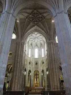 Als Wallfahrtskirche wurde sie im Innern baulich ähnlich ausgestaltet wie andere große Kirchen am Weg nach Santiago de Compostela. Charakteristisch ist der Umgang im Chor hinter dem Hauptaltar, der den reibungslosen Vorbeizug der Pilger innerhalb der Kathedrale und um den Altar und am Kapellenkranz vorbei ermöglichte. Der Kranz von Kapellen stammt aus dem 15. und 16. Jahrhundert. Ursprünglich sollten drei Apsiden gebaut werden, die durch Zwischengewände getrennt waren. Verwirklicht wurde aber nur der zentrale Chor. Von der romanischen Kirche sind im Chor skulptierte Säulen, Pfeiler und reich geschmückte Kapitelle erhalten.[4] Bemerkenswert sind auch die Buntglasfenster.