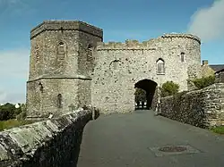 Das Ensemble war ab dem 14. Jh. vollständig von einer massiven Mauer umgeben, die ursprünglich vier Tore aufwies. Von diesen hat nur das Tower Gate (walisisch: Porth-y-Tŵr) überlebt, das an den Glockenturm des 13. Jhs. anschließt und den Weg von der Kathedrale ins Stadtzentrum von St Davids öffnet. Im Tower Gate wird der Abraham Stone aufbewahrt, der im keltischen Stil verziert ist. Er erinnert an die Söhne Hedd und Isaac des Bischofs Abraham (1078–1080), Vorgänger des Erbauers Peter de Leia, der beim letzten räuberischen Überfall von Wikingern auf St Davids getötet wurde[3].