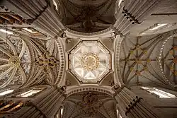 Der Grundriss der Kathedrale zeigt die Form eines lateinischen Kreuzes; ihr Aufriss ist basilikal mit erhöhtem und eigenständig belichtetem Mittelschiff sowie deutlich niedrigeren Seitenschiffen. Die Schubkräfte des Mittelschiffsgewölbes werden über Strebebögen abgeleitet. Während sich im Chor und in Teilen des Querhauses noch der typisch gotische dreiteilige Wandaufriss mit Arkadenzone, unbelichtetem Triforium und Lichtgaden erhalten hat, ist der Wandaufriss im Mittelschiff nur noch zweiteilig – das Triforium entfällt. Die oberen Teile der Kirche wurden im 16. Jahrhundert sowohl architektonisch als auch dekorativ (Grisaille-Malereien) umgestaltet. In dieser Zeit wurden auch die ursprünglich vorhandenen und in den Seitenschiffen noch erhaltenen Kreuzrippengewölbe durch schmuckvollere Sterngewölbe ersetzt. Künstlerischer Höhepunkt des Bauwerks ist der Laternenturm (cimborrio) über der Vierung, dessen unterer Teil mit zahlreichen nackten allegorischen Figuren im Stil Michelangelos bemalt ist.