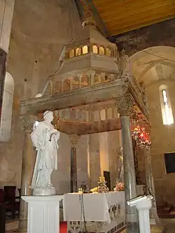 Meister Mavro hat im 14. Jahrhundert im Inneren der Kathedrale einen großen Altar in Form eines Baldachins gebaut. Auf dem Ziborium sind Skulpturen der Jungfrau Maria und des Erzengels Gabriel zu sehen (Verkündigung des Herrn) und seitlich vom Altar stehen Skulpturen des hl. Johannes von Trogir (sv. Ivan Trogirski) und des hl. Laurentius (sv. Lovre) aus dem 18. Jahrhundert. Die achteckige Kanzel mit romanischen Kapitellen ist ein Werk der einheimischen Kunstschule und wurde im 13. Jahrhundert fertiggestellt, die Chorbänke aus Holz hat Ivan Budislavic geschnitzt.[8]
