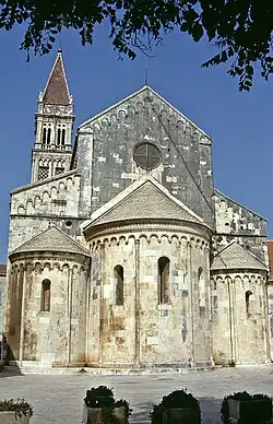 Der Bau des neuen Bischofssitzes, der Kathedrale, begann 1213 auf den Grundsteinen dieser Basilika, die im Jahr 1123 von den Sarazenen zerstört worden war. König Koloman unterstützte den Bau der Kathedrale und beschenkte sie mit höheren Begünstigungen und Geldern, als es kroatische Könige je vorher getan hatten.[5] Im großen Ganzen im Jahr 1251 fertiggestellt, wurde an dem Gebäude, zuletzt am Glockenturm, bis 1698 gearbeitet.